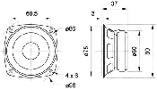Rated power 10 Watt Maximum power 15 Watt Nominal impedance 8 Ohm Frequency response (-10 dB) 130 - 20000 Hz Mean sound pressure level 86 dB (1W/1m) Maximum cone displacement 4 mm Resonance frequency fs 150 Hz Magnetic induction 1,4 Tesla Magnetic flux 200 µ Weber Height of front pole-plate 3 mm Voice coil diameter 1,5 cm Height of winding 0,5 cm Cutout diameter 7,5 cm Net weight 0,24 kg D.C. resistance Rdc 7,4 Ohm Mechanical Q factor Qms 5,3 Electrical Q factor Qes 1,38 Total Q factor Qts 1,09 Equivalent volume Vas 0,67 l Effective piston area Sd 30 cm2 Dynamically moved mass Mms 1,7 g Force factor Bxl 2,5 T · m Inductance of the voice coil L 0,62 mH
